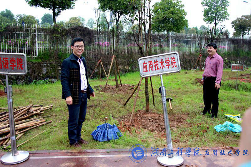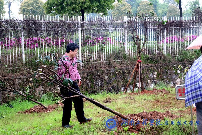 往一个偏僻的小角落看去,应用技术学院党总书记李爱国穿着雨衣带领几位老师在认真的一锹锹从旁边铲起土填入树坑,慢慢的堆砌起围堰,填满崭新的新土,再提桶浇水,道道工序亲力亲为。似乎桂花树也感受到了周围的细心,稳稳的挺在风雨中。