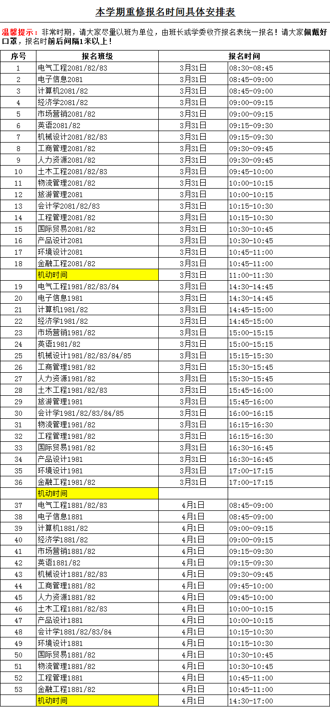 请各班级按以下时间安排排队报名(附表)