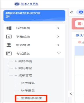 2.重修课程报名:登陆成功后,系统主界面左端依次点击“考试报名”——“成绩管理”——“重修报名选课”,即可查看本学期可报名的重修科目。