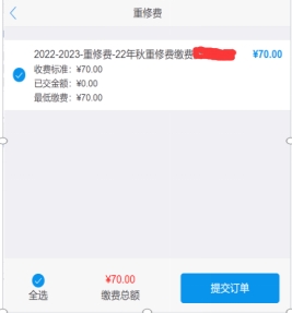 (4)勾选要进行缴费的项目,确认缴费金额,提交订单。