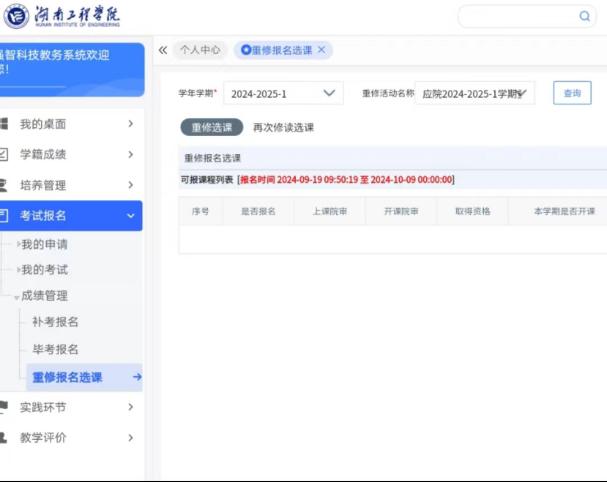 重修课程报名:登陆成功后,系统主界面左端依次点击“考试报名”——“成绩管理”——“重修报名选课”,即可查看本学期可报名的重修科目。(注:报名界面“学期”选择“2024-2025学年第二学期”;“重修活动名称”选择“应院2024-2025-2学期重修”)