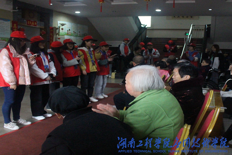 一走进敬老院,坐在大厅里的爷爷奶奶们便亲切的喊着志愿者们们的名字。志愿者前往老人的房间,邀请老人们去往一楼大厅观看表演。他们带来的节目有歌曲《军中绿花》,《游京》等,舞蹈有《酒醉的蝴蝶》《最炫民族风》,还有花鼓戏《刘海砍樵》,最后以大合唱《歌唱祖国》来作为结尾,老人们打着节拍,跟着志愿者的节奏小声的哼唱着。志愿者的表演结束后,有些老人也按耐不住自己激动的心情,一展才艺给大家带来一曲。在表演结束之后志愿者们围在老人们的身边,亲切的和老人们交谈起来。新来的志愿者积极的向老人们介绍自己,而那些和老人们有着长期交流的志愿者们分享着自己在学校的事情,问候老人最近的身体状况。