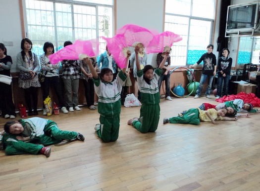 随后,带着满满爱心的志愿者们来到了湘潭市特殊教育学校。一进校园就看见孩子们正在为第八届残运会开幕式舞蹈进行排练。在他们休息之余,我们与这群可爱的孩子进行了交流。我院青年志愿者们给这些孩子们带去了精彩的表演,有舞蹈、双截棍、魔术等节目,而最感人的莫过于工管0881班带来的手语节目《隐形的翅膀》了。节目表演过程中,孩子们认真的观看着,还不时地会心一笑。小朋友们也为我们准备了一些小节目,在老师的手语指导下,他们“跟着”音乐的节拍为我们带来了美丽而又可爱的舞蹈。在最后,青年志愿者们把带来的一些小礼物和食品分发给了小朋友们,还用纸和笔跟他们交流了起来。有一个小朋友高兴的在纸上写下了“我觉得今天他们来我们很开心”13个字。