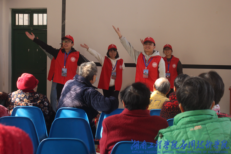 下午14:00,志愿者准时在校门口集合出发,怀着兴奋激动的心情踏上了去敬老院的道路。刚到达敬老院门口就有眼尖的老人看见了志愿者团队,老人们开心的呼喊着志愿者们的名字,老人们的热情是让志愿者们感到更加开心。志愿者们随老人们进入了院里,按照事先的安排为老人进行了节目表演,歌曲《军中绿花》、舞蹈表演赢得了老人们阵阵掌声,之后志愿者曾彪带来的花鼓戏《补锅》更是逗得老人们哈哈大笑。