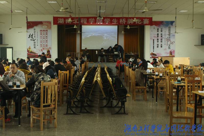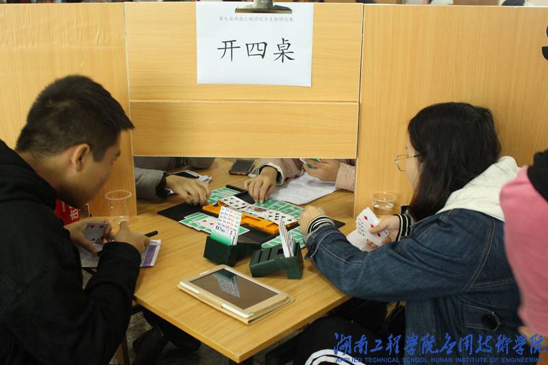 12月1日下午,前三轮的比赛打响。在应院一队和纺织二队的比拼中,我院选手在第二副牌中灵活使用“阻击”叫牌技巧,成功阻止对手得分。在后续的出牌中,应院一队巧用“飞牌”,以本队扣除100分的代价阻挠对手获得600分的机会以力挽狂澜,险胜对手。团体赛结束,长沙学院二队以64.44的高分摘得前三轮比赛的桂冠,湖南大学二队以60.94分稳居第二,我院一队获得第三名。