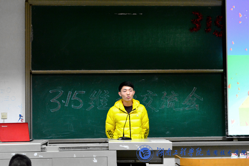 3月20日晚上7:30,我院团总支学生会维权部首届维权交流会在南校区第一教学楼303教室举行。此次交流会的主题是:“315国际消费者权益日 用诚信力量为你服务。”团总支学生会副主席陈浩、纪检部部长申志豪、文娱部部长欧阳光、各班班委代表参加了此次交流会,维权部部长周文龙担任主讲人。