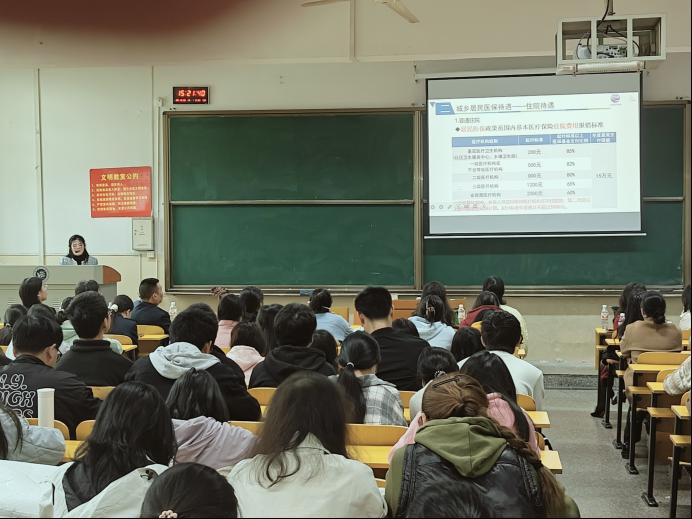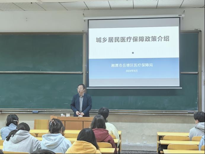 在陶连洲就举办医保政策宣讲会的目的和意义进行了简要介绍后,岳塘区医保局龙文娟详细宣讲了湘潭市城乡居民医疗保障政策。她从城乡居民参保范围、城乡居民医保待遇、异地就医、医疗救助等方面进行了详细讲解。在互动环节,医保局领导耐心、详细地逐一解答了师生关注关心的相关问题。