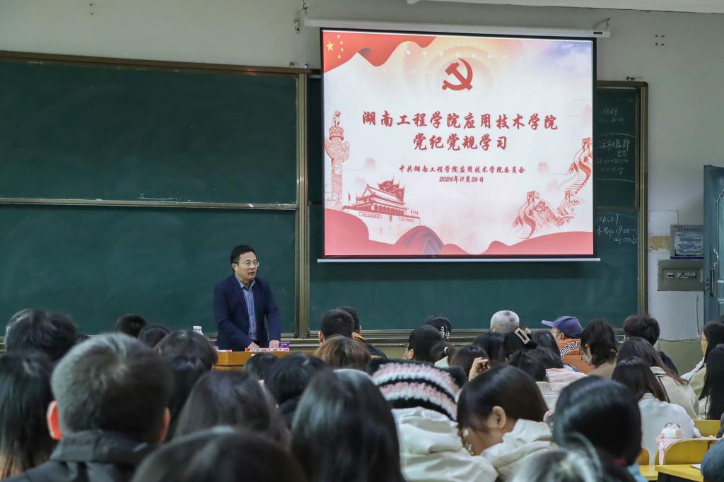 为进一步加强党员党纪党规教育,增强党员纪律意识、规矩意识,深化大学生党员发展全链条教育提升工作,11月26日下午,我院在南一教学楼112教室开展党纪党规学习教育专题党课。365英国上市纪委监察专员办公室副主任刘光辉应邀来院授课,党委书记严明,教职工支部党员、学生各支部党员、入党积极分子160余人参加,党委副书记陶连洲主持。