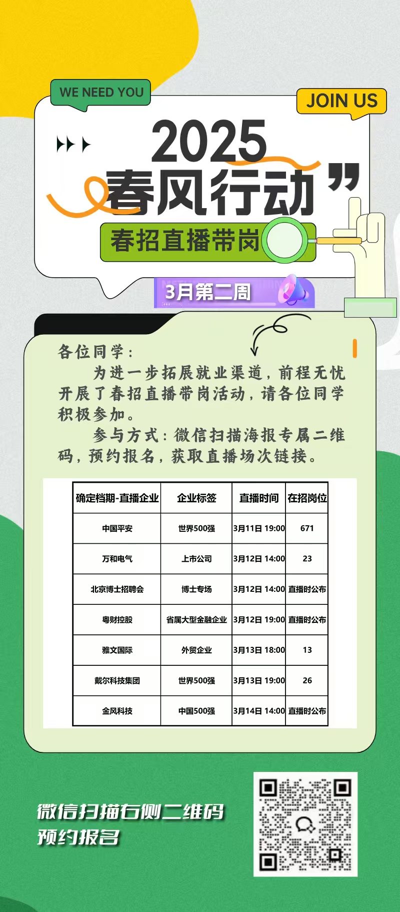 各位同学:为全面贯彻落实党中央、教育部关于促进高校毕业生就业工作的决策部署,切实做好毕业生就业工作,进一步拓展就业渠道,我校联合前程无忧开展了“春招直播”带岗系列公益活动,请各位同学积极参加。参与方式:微信扫描海报专属二维码,预约报名,获取直播场次链接温馨提示:此次活动为公益活动不收取任何费用。请大家重视起来,积极报名参加,预祝大家都能找到自己理想的岗位!
