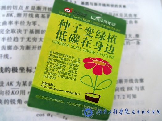 5月18日,由iearth——爱地球环保公益机构、新浪微博校园赞助,校团委主办,校环保协会承办的全国大学生绿植领养活动“pay it forword——把爱传下去”走进我校,活动分别在北校区学海花园、新校区教学楼前坪以及南校区七栋前坪热烈展开。此次活动从5月17日起,为期三天,面向我校全体师生,旨在唤起大家的环境保护意识,提倡低碳生活。