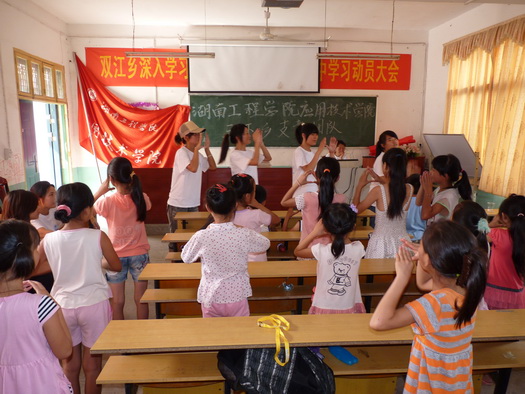 在我院与中南林业科技大学涉外学院“三下乡”社会实践团队师生38人的组织和策划下,7月23—24日,将当地留守儿童31人召集至双江乡逸城希望小学开展了一系列支教活动,带领孩子们走入了别开生面的课堂。同学们给可爱的孩子们带来了内容丰富多彩的舞蹈课、音乐课、美术课,我院娄申老师也情不自禁地走上了讲台,同孩子们激情互动。