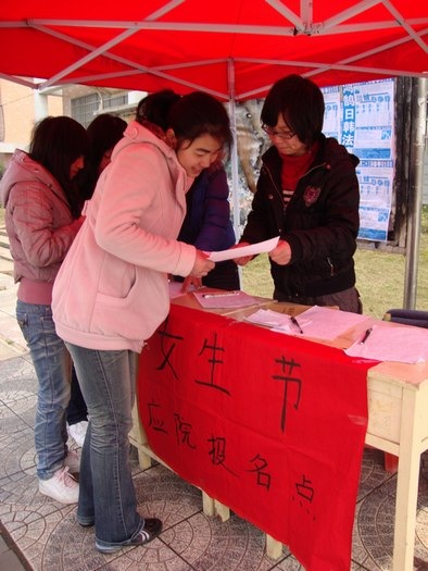 3月9日中午,趁着大家就餐时间,各学院的报名活动在食府前正式拉开了帷幕,我院女生部设立的活动报名点也在其中,正如火如荼地进行着。在报名现场,我院的同学们激情四射,踊跃参加。其间,记者采访了一些报名的同学,她们都展示了自己的自信,发出了“我的青春我疯狂”的口号,并表示通过这样的活动不仅能让她们获得无尽的乐趣,还可以认识更多新同学和新朋友,所以,一定会努力争取在活动中做到最好。学生会女生部部长陈志超告诉记者:“我院同学对此次活动表现得非常积极,截止到中午已有六十多组(人)报名,可以说是一个庞大的队伍,相信她们会为我院赢得风采。同时,我们也会努力策划这次活动,绝不会让大家失望。”