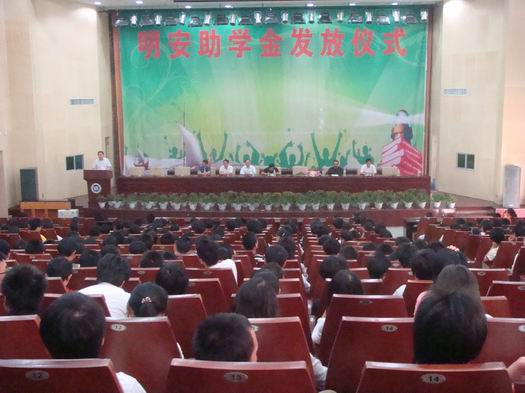 9月22日下午3:30,明安助学金发放仪式在一报告厅内隆重举行,经过一系列严格的评审之后,我校共有33人进入了第一届明安助学金的发放名单,其中我院电气0781班陈治宇同学和会计0886班刘琴同学获得了此次助学活动的资助。