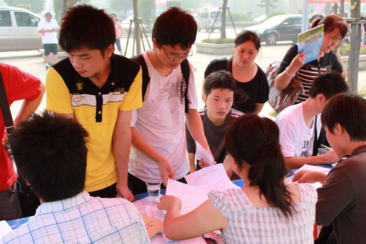 报到处:班导及班导助理们早已各就各位,迎面对新生,背面朝骄阳,这就是他们的工作环境;抬头答疑问,低头填档案,这就是他们的工作任务。工作之余许多班导还要和新生们聊聊天,以帮助他们早早地适应这个全新的环境。