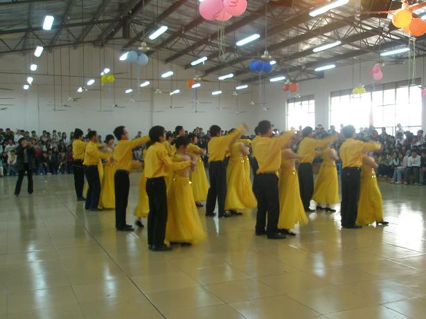 随后进行的集体舞则是一道视觉大餐,各代表队的队员身着华丽的服装,一一亮相。尤其是我院代表队一出场就吸引了全场观众的眼球。从自信的笑容、统一的服装和精致的舞蹈编排上可以看出他们在赛前下了一番功夫,付出了不少心血。全体队员身着亮黄色的舞衣,女生裙裾飘飘,男生风度翩翩,他们优美的舞姿仿佛把观众们带到了华丽的晚宴现场,让人叹为观止。