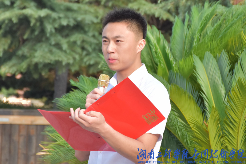 全体人员合唱中华人民共和国国歌后,经济学2181班学生陈吉辉作为预备党员代表发言。他向党组织表达“三个决心”——提升个人思想政治修养,理论武装头脑;坚持全心全意为人民服务;发挥党的先锋模范作用。