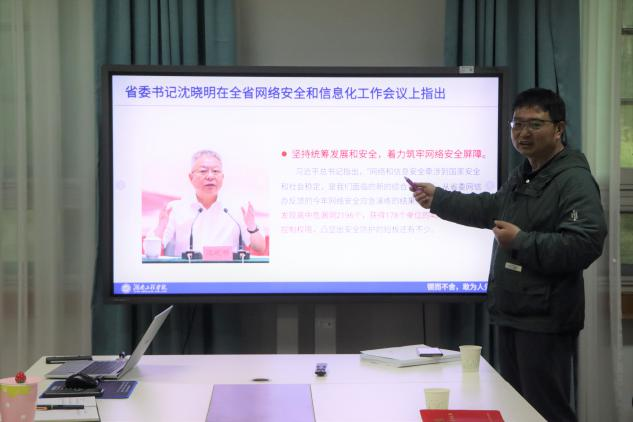 张何作总结发言。他进一步强调了网络安全的重要性,指出各部门要进一步加强对学院网站发布内容的审核工作,强化重要信息系统防护,严格落实网络安全责任,确保各自部门的信息安全,做到守土有责。