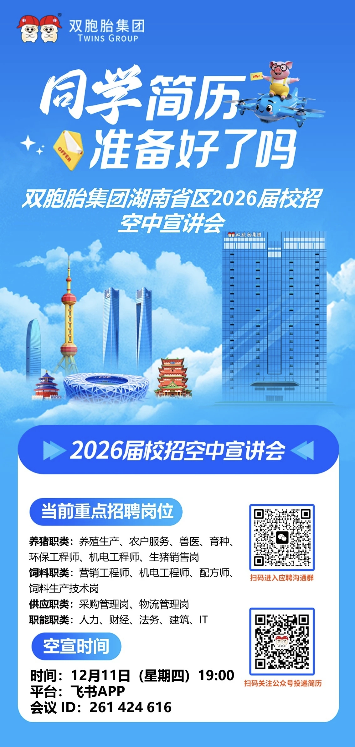 官方渠道投递简历处理更高效:关注“双胞胎集团招聘”微信公众号或登录双胞胎集团官网(https://www.sbtjt.com),点击2026校园招聘进行应聘,网申选择湖南站点。