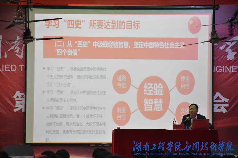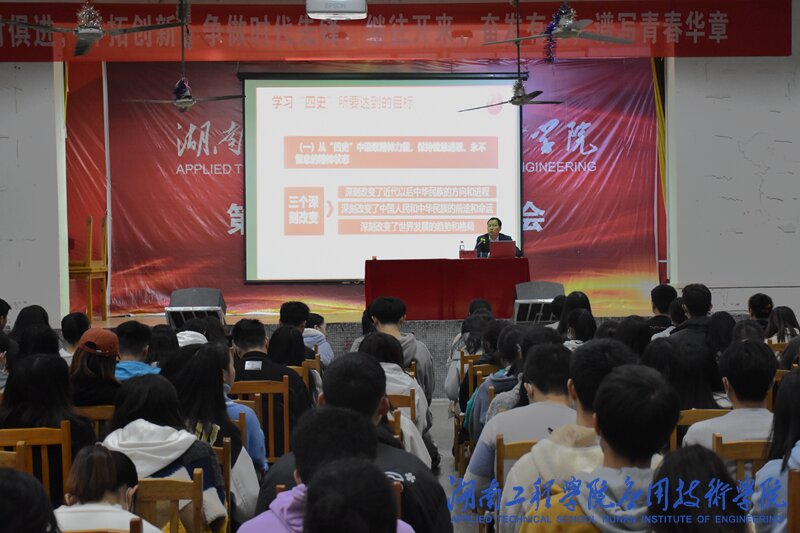 11月18日晚上7:00,副校长魏克湘在第一教学楼四楼学生活动中心为我院师生讲“学习传播四史,砥砺奋进前行”主题党课。