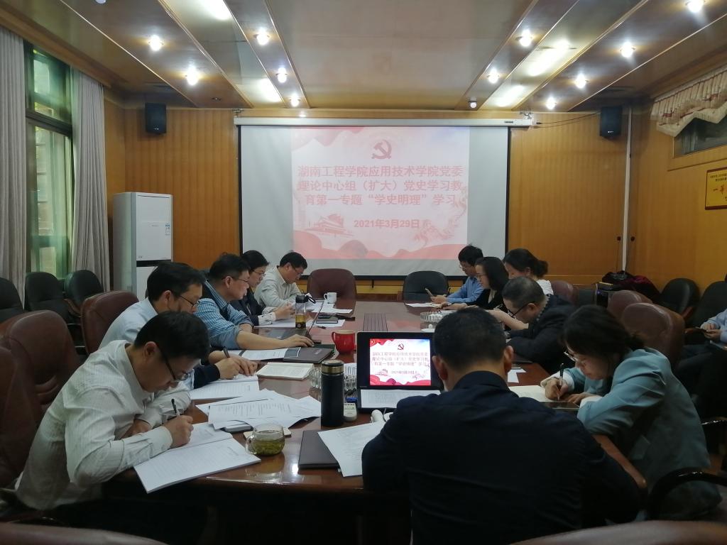 3月29日下午,应用技术学院党委理论学习中心组七名成员在院会议室进行党史学习教育第一专题学习。此次中心组理论学习扩大到了全体教工党员。