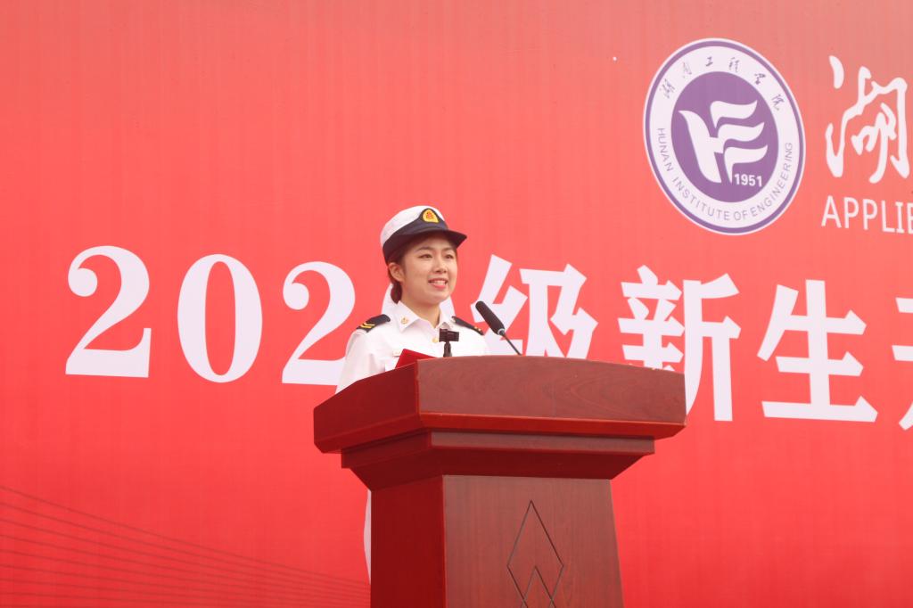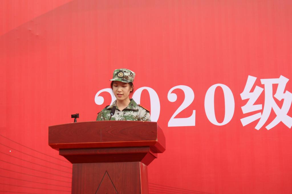 在校学生代表、国际经济与贸易1881班周珍发言,她告诉大家自己是一名退役军人,两年军旅生活给了她战胜困难的信心和勇气,珍贵的战友情,她鼓励新生发扬不怕苦,不怕累的精神,在成长道路上如战友般砥砺相助,团结协作,共克难关,共同进步。