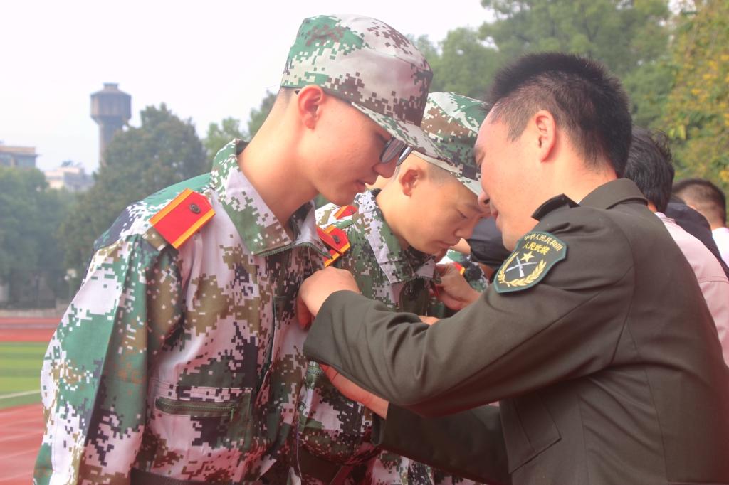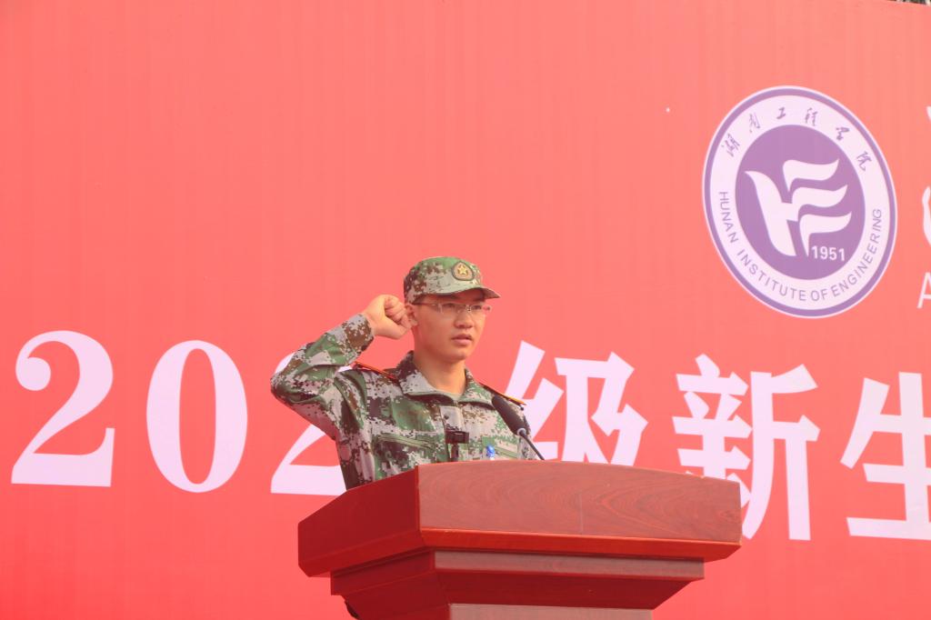 现场领导为新生代表佩戴校徽,全体新生佩戴校徽。其后,全体新生进行入学宣誓,工程管理2082班熊海鹏领誓:牢记“锲而不舍,敢为人先”的校训,胸怀祖国, 忠于人民......”铿锵的誓言响彻操场上空,蕴含着青春无限的力量。
