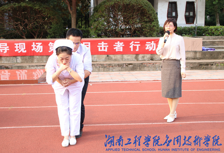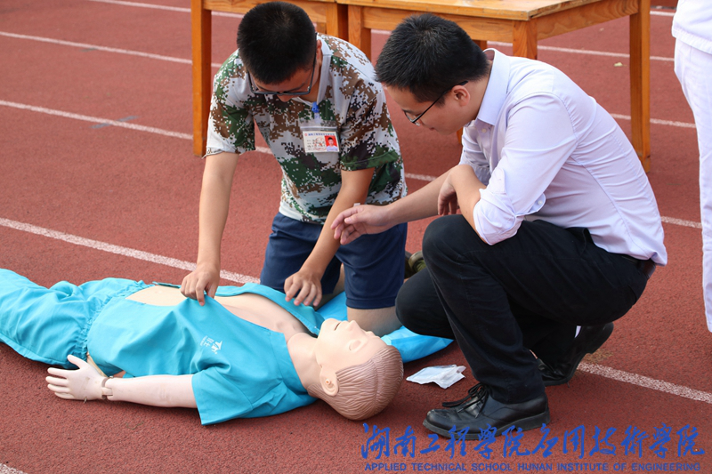 9月28号下午4:00,为了宣传普及医疗急救知识,湘潭市第一人民医院急诊科主任胡艳娟带领急诊急救专科小组来我院田径场给18级新生进行急救医疗知识培训,本次活动由我院党总支副书记徐粤宇主持。