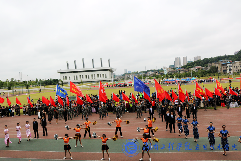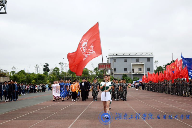 在分列式进行曲的激昂伴奏下,十四个方阵用它们独具特色的精彩表演尽显学院精神,诠释运动魅力。首先入场的计算机与通信学院方阵队,他们由由国旗队、院旗队以及“三个梦想”队列组成。“三个梦想”分别为:中国梦,湖工梦,计通梦,生动地表达了每一个学生的青春梦想,队列变换成为3w和金字塔的形状,代表计算机与通信学院对信息技术孜孜不倦的追求。管理学院方阵队则带来了贪吃蛇行径的队列,他们不断变换队形,看似错综复杂实却井然有序,手中紧握的彩虹伞彰显出青春活力。纺织服装学院的队伍为在场所有观众展示了一场精彩的服装秀,精致华丽的服装与优雅端庄的台步,令人过目难忘,赞叹不已。我院方阵队作为最后压轴惊艳亮相。首先入场的是我院礼仪队,她们着藏蓝色和浅粉色旗袍,袅袅婷婷,款款而行。其后,我院校卫队男生身穿迷彩,一套军礼拳一气呵成,尽显阳刚威武气概,博得现场热烈的掌声。之后是一场彰显青春之姿的T台秀和活力四射的啦啦操表演,刚柔相济,内敛和张扬结合的表演引得现场阵阵尖叫和欢呼声。最后,我院表演方阵放飞手中的气球,五彩的气球朝更高的天空飞去,就像现在的我们,选择了理想和远方,就只管风雨兼程。