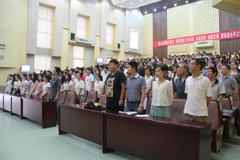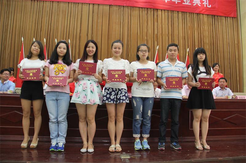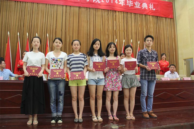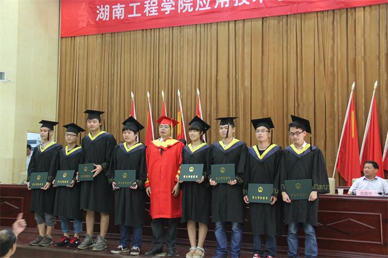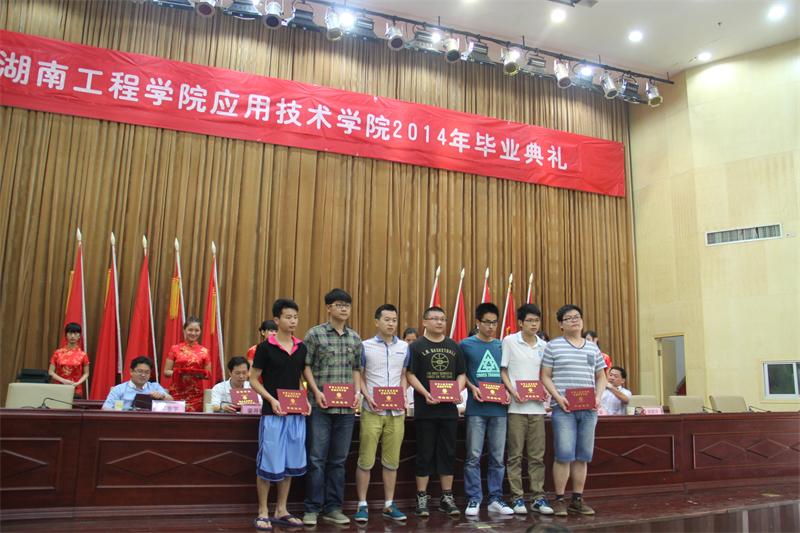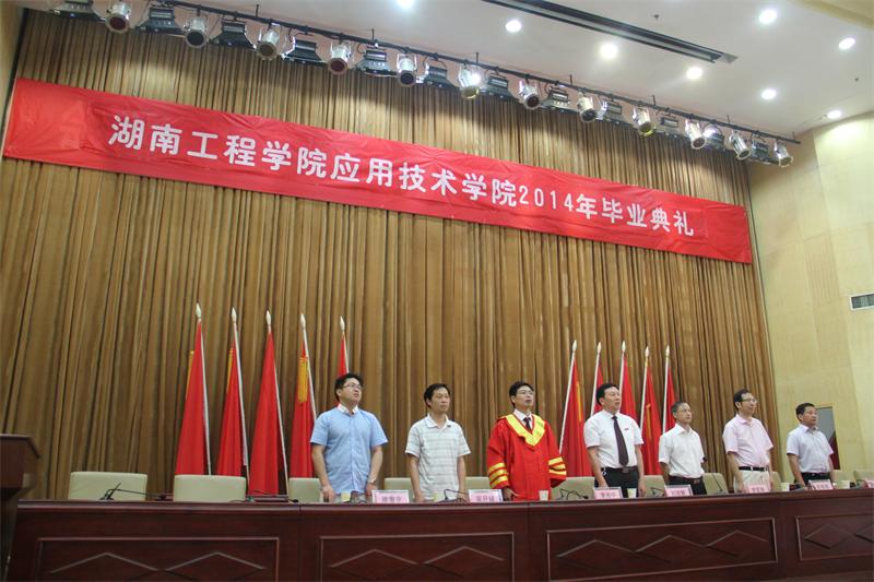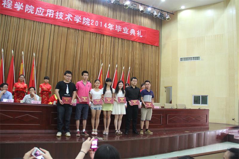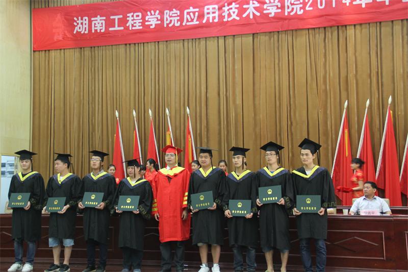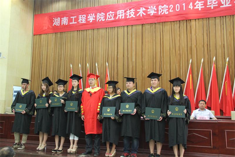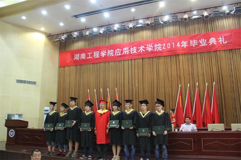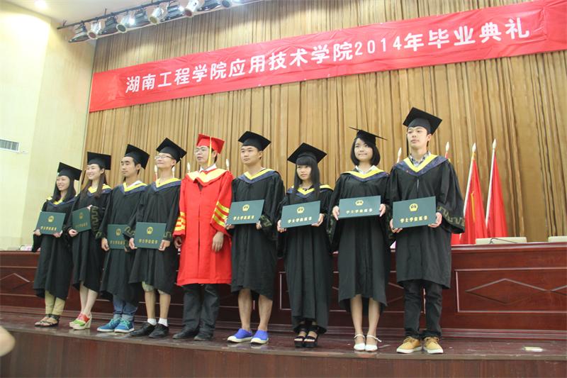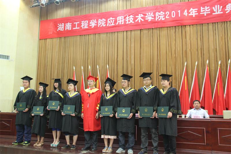 在主席台就座的领导为毕业生代表颁发了毕业证书。应用技术学院院长李光中为毕业生代表正冠、拨穗,颁发学位证书。随着校歌的响起,我院2014年毕业典礼圆满结束。