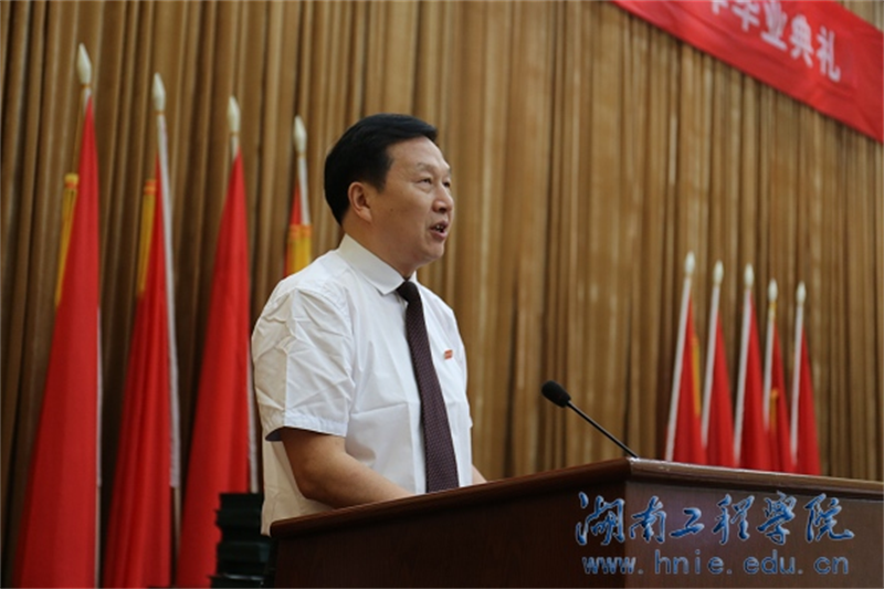 刘国繁代表学校向毕业生表达了最衷心的祝贺和最美好的祝愿。他感谢四年来同学们把最美好的青春留给了湖工,感谢大家为学校的发展所作出的重要贡献。他向大家提出了毕业以后的期待:一是勤学多做,规划好人生。他说,拿到大学毕业证并不是代表掌握了所有的本领,而仅仅证明着你做好了踏入社会的准备。要静下心来,冷静思考,找准方向,做好职业生涯规划。二是谨记坚持的力量,“不积跬步,无以至千里;不积小流,无以成江海”,也许在困难的时刻,坚持一点点,就会触摸到成功。要相信坚持就是胜利,任何时候都不要轻言放弃,人生没有失败,只有放弃。三是“从小事做起,从细节做起”,发扬踏实做事,不事张扬的作风。任何平凡的小事都蕴含了深刻的道理,希望同学们以“严谨、理性、务实,专业”的精神认真做事,牢记“细节决定成败的”道理。刘国繁最后深情地表示,母校永远是大家的“家”,母校的大门永远为大家敞开,希望大家把对湖工的美好回忆带走,把湖工的精神传承!