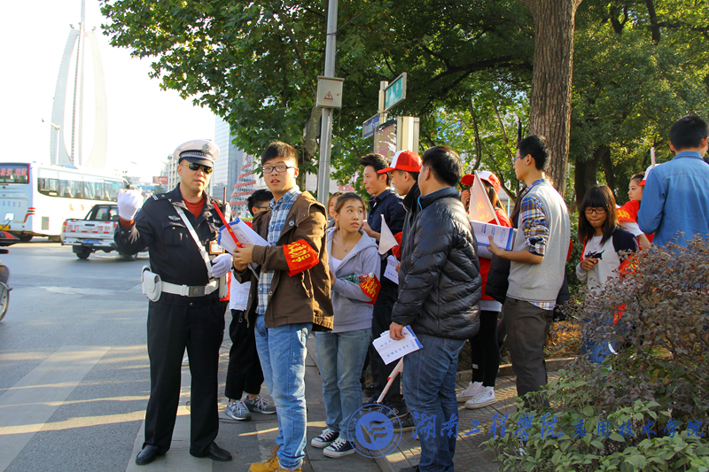 出发前,交警向志愿者介绍了如何进行文明乘车和文明交通等的劝导。院党总支副书记徐粤宇也叮嘱志愿者,要协助好交警传播文明安全出行的知识,身体力行树立学院学子形象。