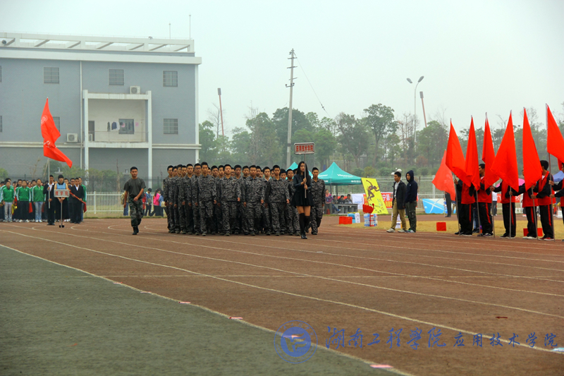 伴随着《运动员进行曲》,旗手们手举院旗,整齐的排列在主席台正前方的田径场内。在旗手们就位后,各学院代表方阵入场,14支方阵踏着整齐的步伐,喊着嘹亮的口号,气势恢宏地走过主席台。我院代表队身着迷彩,踏着无比坚定的步伐,喊着震天的口号:“应院威武,威武应院”,信心十足的向主席台走去,以刚劲有力的军体拳高调亮相;纺织服装学院代表队表演了别出心裁的T台秀,搏得现场观众的阵阵掌声;机械工程学院的扇子波浪舞和热情灵动的啦啦操,美得令人惊叹。各方阵的表演层出不穷,令观众拍手叫好,同学们热情激昂的呐喊声,与运动场上飘扬的彩旗交相辉映,俨然一副生机勃勃的景象。