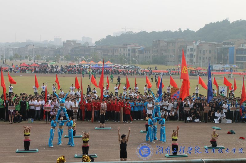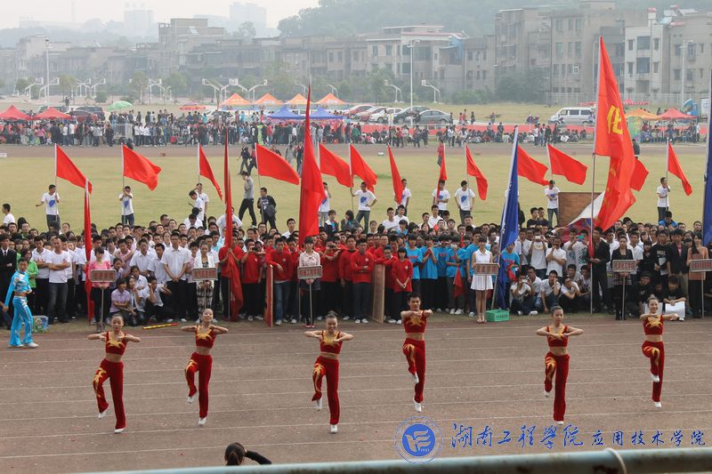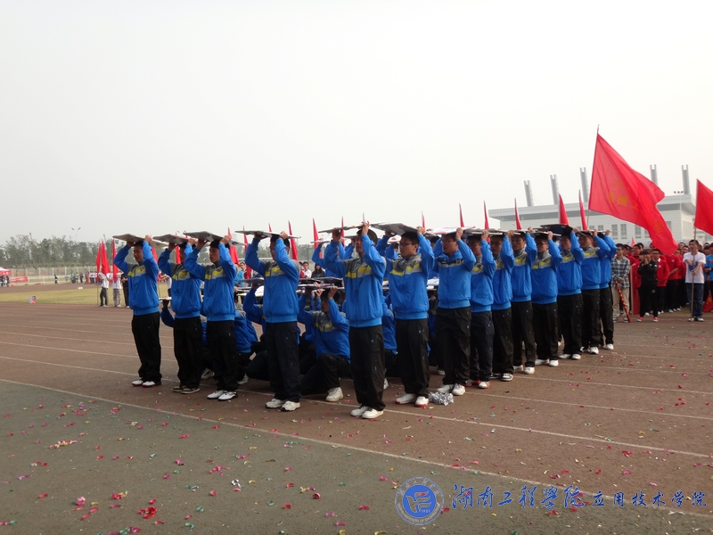 开幕式在庄严的国歌声中拉开帷幕。体育馆现场彩旗飘飘,欢声阵阵,各院学生都在积极的期待着运动会的召开。伴随着振奋人心的《运动员进行曲》,来自各学院的14支方阵代表队犹如钢铁之师从主席台前经过。我院载着去年冠军之师的荣耀,重新踏上了战场。伴随着气势磅礴的“至尊为谁,唯吾应院,应院威武”的响亮口号,我院代表队身着蓝色运动服踏着坚定整齐的步伐、高呼“山中猛虎,水中蛟龙,湖工应院,卧虎藏龙”的口号闪亮出场。随着神曲《江南style》的响起,我院拉拉队在运动场上跳动的热舞,顿时吸引了观众们的目光,动感的节奏,幽默的舞姿,充分体现了我院学子的无限活力。然后,我院50名运动员高举比赛项目的图标列成矩阵,并不断地变换,默契地深蹲、起立排列成“数字倒计时”,向大家展示我院的凝聚力以及同学们对体育的无比热爱,博得了现场观众雷鸣般的掌声与欢呼声。这是一支被誉为冠军之师,龙虎之队的队伍,他们又一次给大家带来了精彩与震撼。