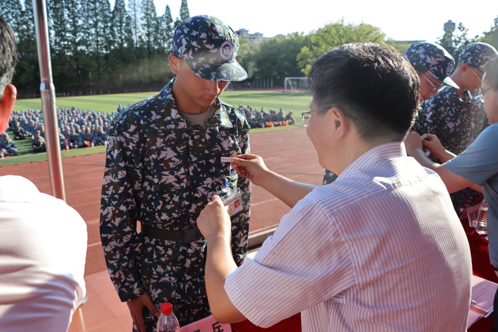 会议的尾声中,校、院领导为新生代表佩戴校徽。方寸之间,校徽浓缩历史与文化,传承责任与担当,记录“湖工”学子的一言与一行。全体2023级新生佩戴校徽,镌刻“湖工”印记,在这片名为“湖工”的沃土上从此扬帆起航。